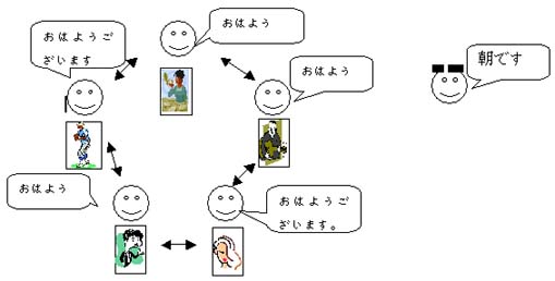 활동순서 5명 정도로 그룹을 만든다. 각 그룹은 유명인의 사진 카드를 모두에게 보여준다. 교사는「朝です」「昼です」「夜です」라고 알려주고, 그룹에게 알맞은 인사를 하게 한다. |