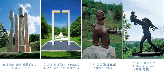 <삿포로예술의 숲>의 최고의 볼거리로는 역시 야외미술관일 것이다. 변화무쌍한 자연의 녹음 속에 일본을 중심으로 현대를 대표하는 조각가와 노르웨이의 거장 구스타프 비게란드(Gustav Vigeland) 등, 64명의 작가의 조각작품 73점이 전시되어 있다. 이들 작품의 대부분은 작가가 실제로 이 곳을 방문하여 지형과 환경, 기후 등을 고려하여 새롭게 제작한 장소 특정적인(site specific)작품이다.