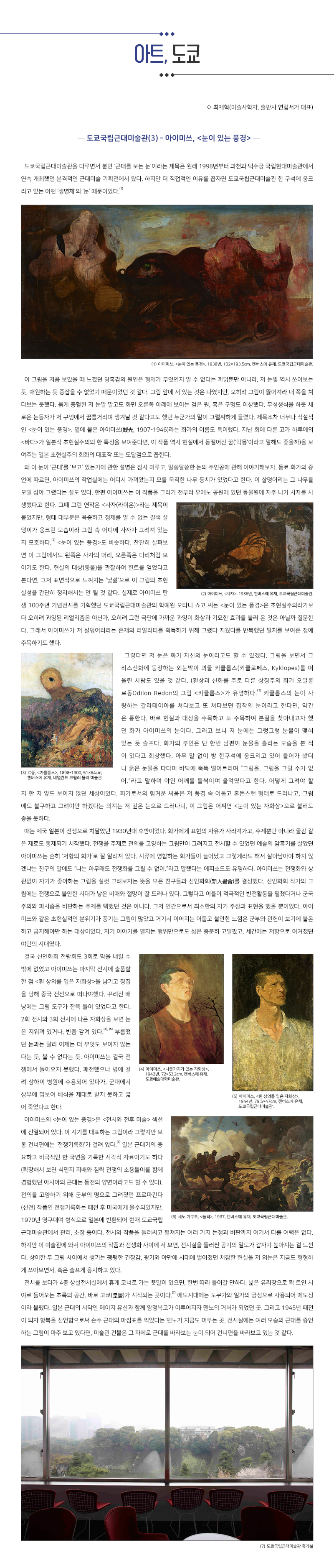 도쿄국립근대미술관을 다루면서 붙인 ‘근대를 보는 눈’이라는 제목은 원래 1998년부터 과천과 덕수궁 국립현대미술관에서 연속 개최했던 본격적인 근대미술 기획전에서 왔다. 하지만 더 직접적인 이유를 꼽자면 도쿄국립근대미술관 한 구석에 웅크리고 있는 어떤 ‘생명체’의 ‘눈’ 때문이었다.