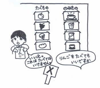 순서) 2) 교사는 음식 그림카드 10장 정도를 칠판에 붙이고, 각각의 단어를 확인한다. 3) 교사는 칠판에 붙인 음식 중에서 먹으면 안되는 음식을 한가지 정해서, 학생들에게 그 음식 명을 알려주지 않고 종이에 적어 둔다. 4) 교사는 한 열을 지정하여 그 열의 제일 앞 자리의 학생부터 차례대로 칠판에 붙은 음식 중 에서 하나씩 골라「りんごを食べてもいいですか」와 같이 질문을 하도록 한다. 교사는 종이에 적어 둔 음식이 아닌 경우에는「はい、いいですよ。どうぞ。」와 같이 대답 하며, 종이에 적혀 있는 것일 경우에는「いいえ、これは食べてはいけません。」과 같이 대답 하고 그 음식명을 적은 종이를 보여준다. 5) 한 열에서 먹어서는 안되는 음식이 걸리게 되면, 다시 먹어선 안되는 음식을 정하여 종이에 적는다. 이 번에는 다른 열의 학생에게 같은 방법으로 질문하고 대답하게 한다. 6) 먹거리 이외에도 음료 내지는 동작 그림카드를 이용하여 동일한 방법으로 진행한다. 게임에 익숙해지면 학생 중 1명을 앞으로 나오게 하여 선생님이 했던 역할을 해 보게 한다.