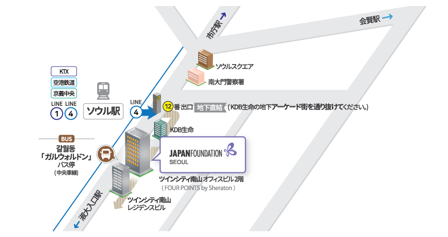 | 地下鉄 | 1号線、4号線、空港鉄道、京義中央線 ソウル駅 12番出口から徒歩3分 | ||